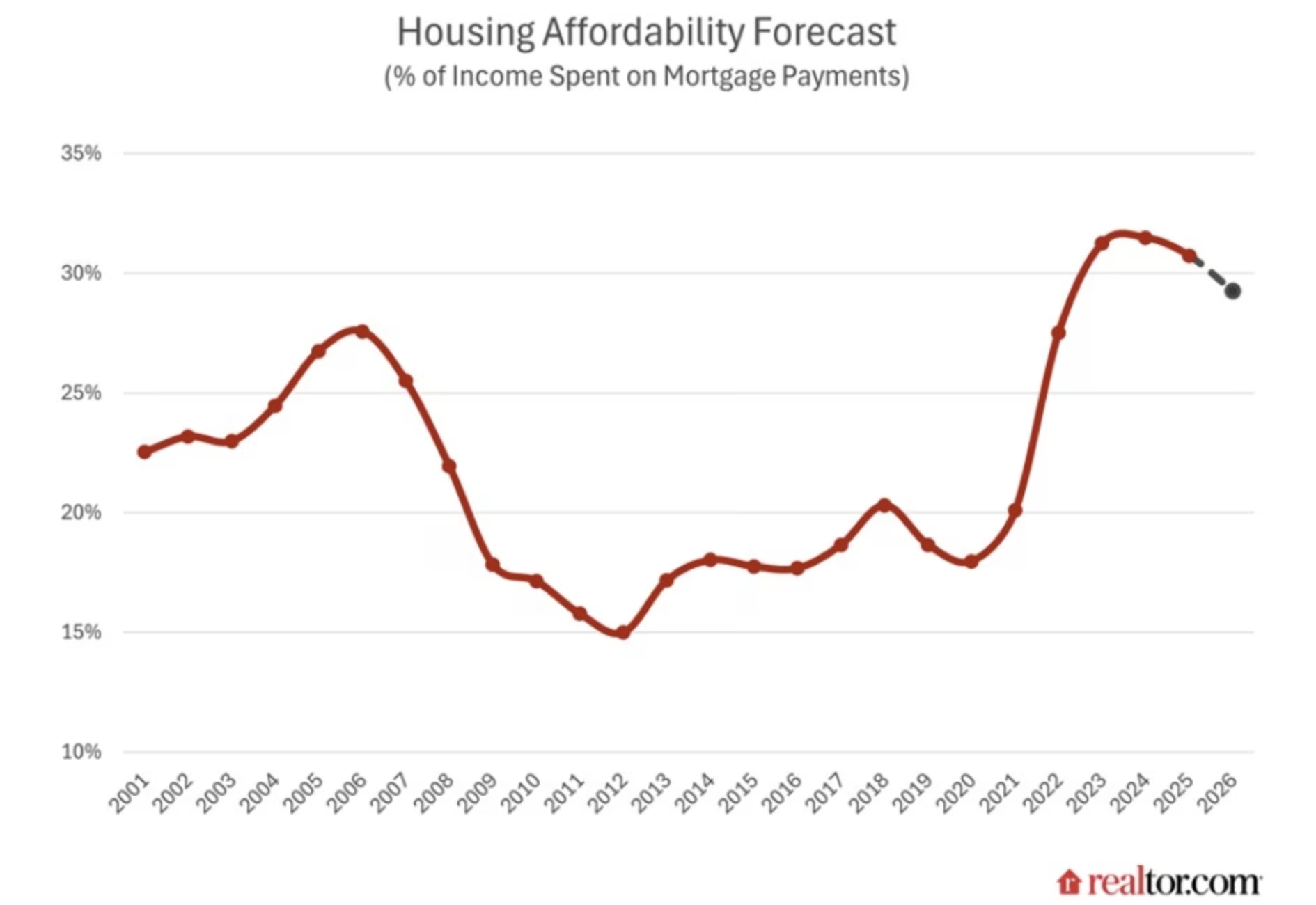 Mortgage rates will continue to average above 6% next year, but affordability will improve modestly as the typical monthly payment falls below 30% of a household's income for the first time since 2022, the Realtor.com® economic research team predicts in its 2026 housing forecast.