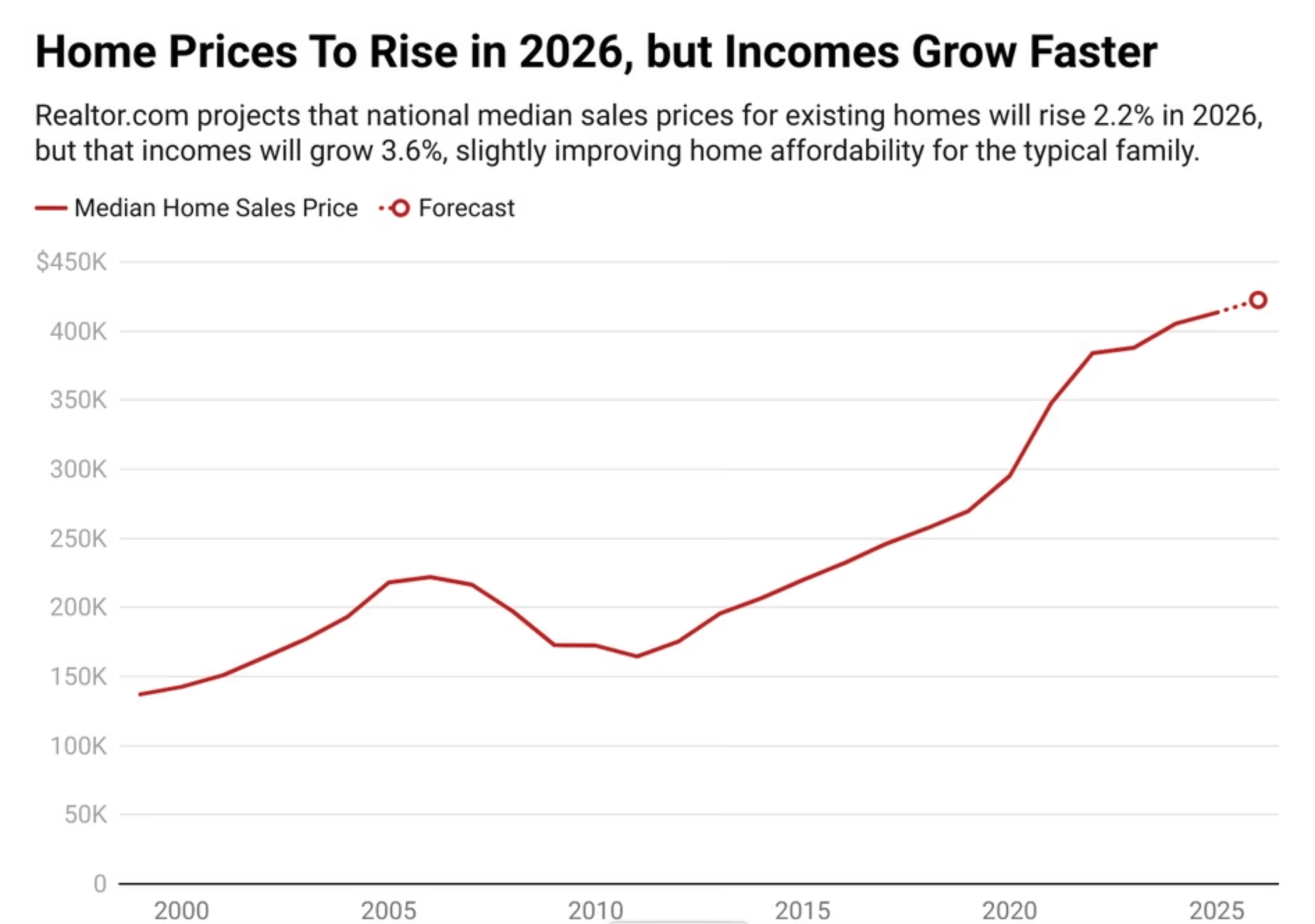 “After a challenging period for buyers, sellers, and renters, 2026 should offer a welcome, if modest, step toward a healthier housing market,” says Realtor.com Chief Economist Danielle Hale. “Incomes climbing faster than inflation as mortgage rates steady at a lower level create space for affordability to improve."