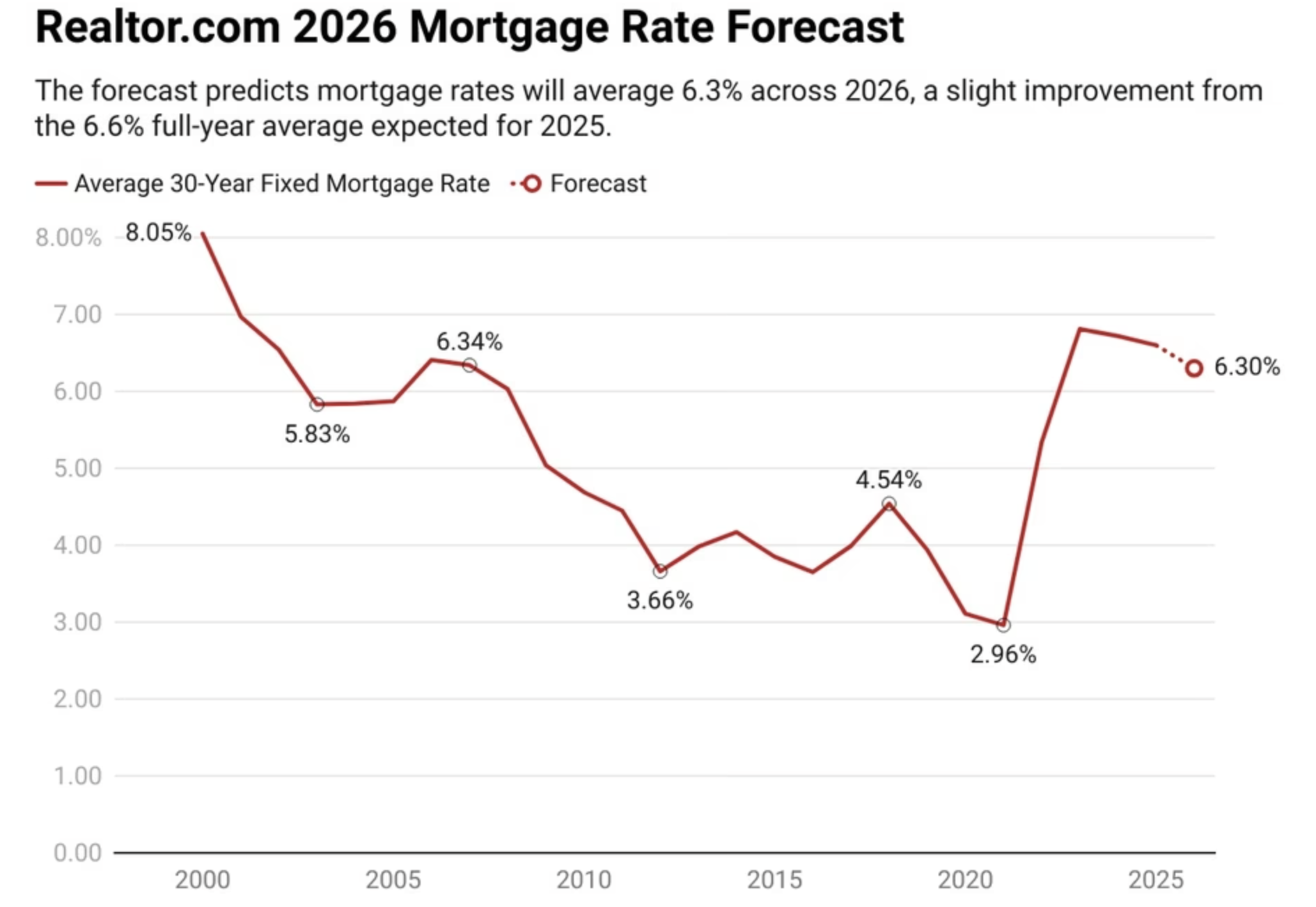 The forecast predicts mortgage rates will average 6.3% across 2026, a slight improvement from the 6.6% full-year average expected for 2025, but still well above the 4% historic average recorded from 2013 to 2019.