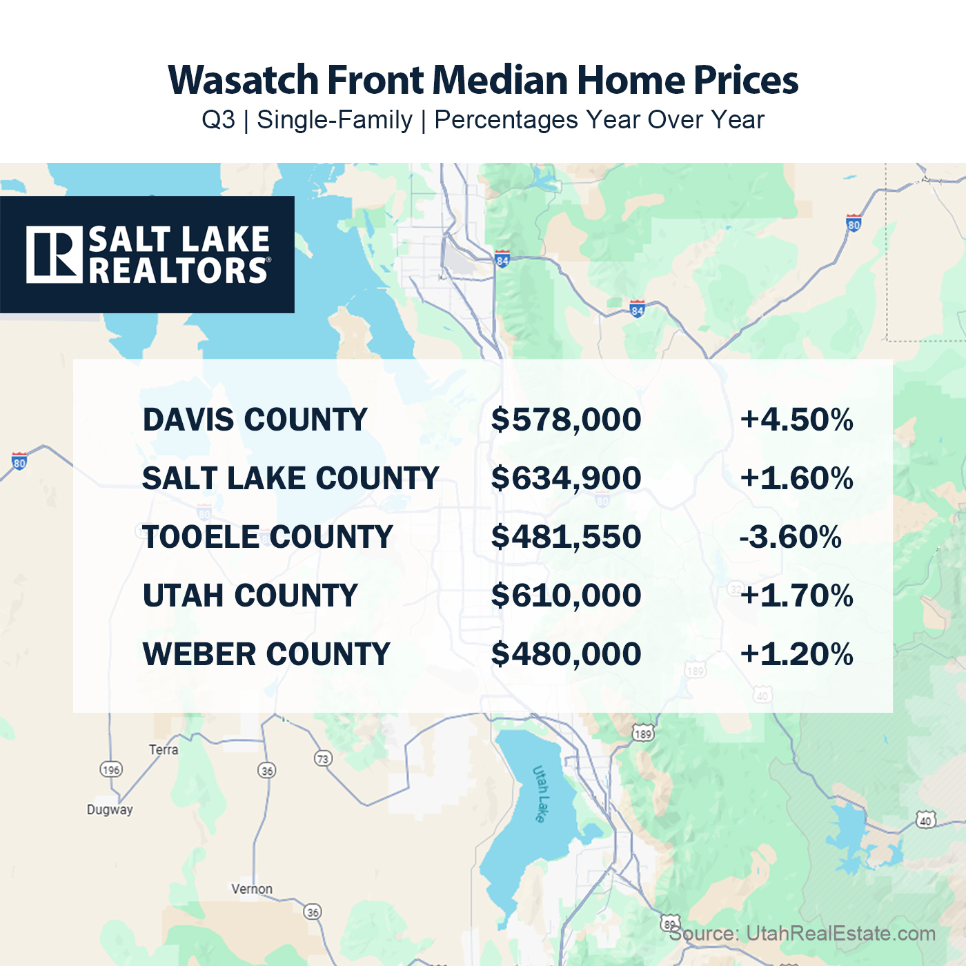 Salt Lake Board of Realtors Updated Housing Numbers: An earlier post showed prices dipping, but the finalized data shows modest gains across most of the Wasatch Front. Single-family home prices are still edging up, even with high mortgage rates and tighter budgets. The main reason is simple: there just aren’t enough homes for sale. Utah’s population keeps growing, but inventory remains low because many homeowners are staying put with their 2–3% mortgages. Strong job growth, steady in-migration, and the area’s lifestyle appeal continue to fuel demand, keeping prices from slipping much. Davis County led the way with a 4.5% jump, followed by modest gains in Salt Lake, Utah, and Weber counties, while Tooele saw a slight dip. It’s not another housing boom—it’s a slow, steady market defined by scarcity.